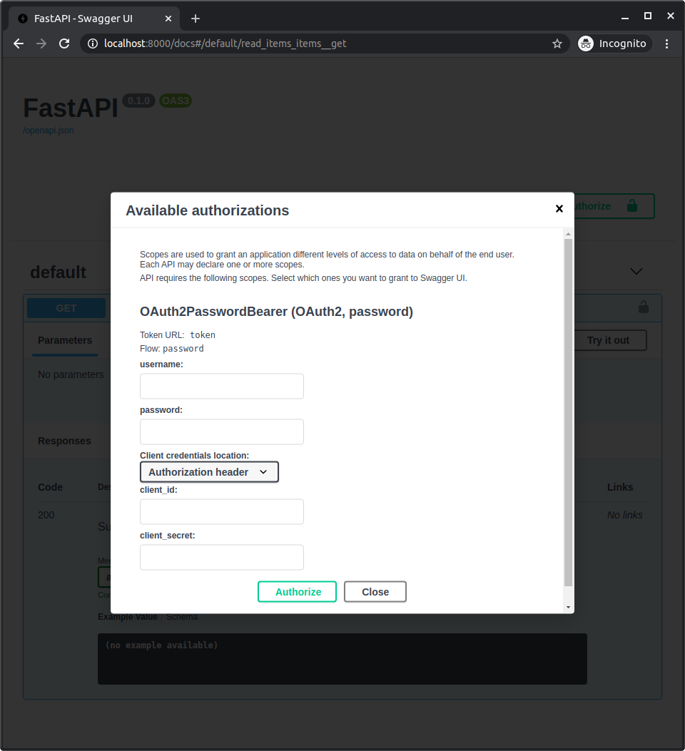 Здесь tokenUrl="token" ссылается на относительный URL token, который мы еще не создали. Поскольку это относительный URL, он эквивалентен ./token.